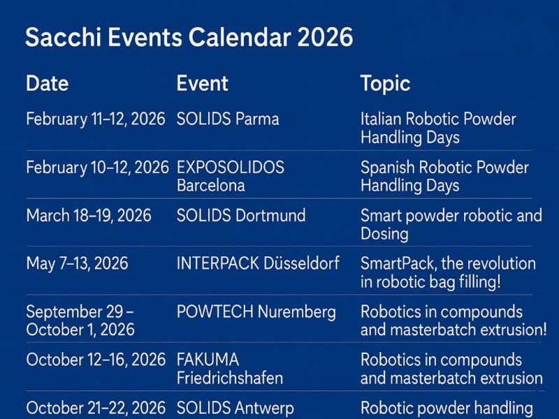Sacchi und der deutsche Partner möchten sich bei den Tausenden von Menschen bedanken, die ihren Stand auf der Powtech 2016 (19.-21. April) besucht haben und das unaufhaltsam wachsende Interesse an unseren innovativen patentierten Robotertechnologien gesehen haben.