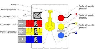 El sistema es modular y configurable para la gestión de 1 a "n" transportadores de rodillos de entrada y otras tantas estaciones de vaciado. Además, la capacidad horaria del sistema se puede aumentar en pasos posteriores añadiendo robots adicionales (incluso más tarde).